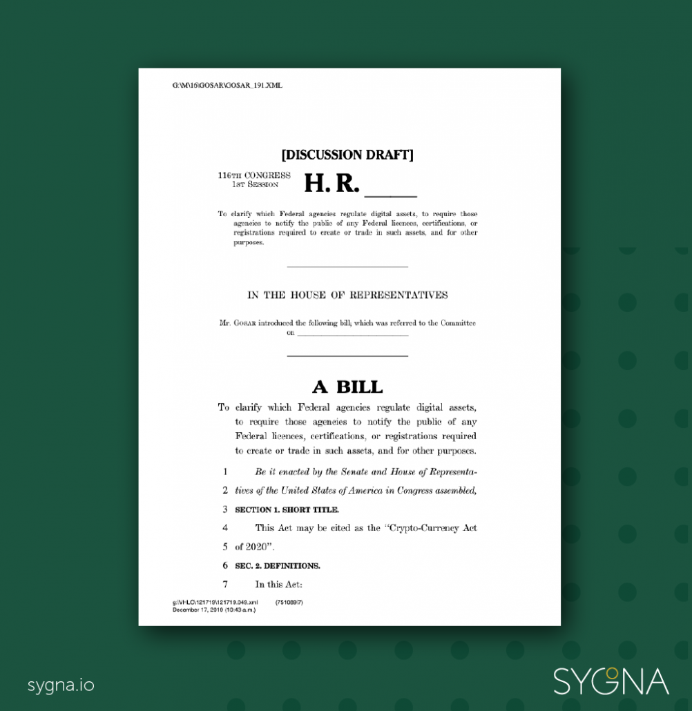 On 20 December 2019, U.S. Congressman Mr. Paul Gosar (Arizona Republican) introduced the draft bill in secret to the House of Representatives in order to bring “regulatory clarity” to cryptocurrencies. This entailed defining various types of digital assets and assigning federal regulators to police digital assets that fall in their jurisdiction.